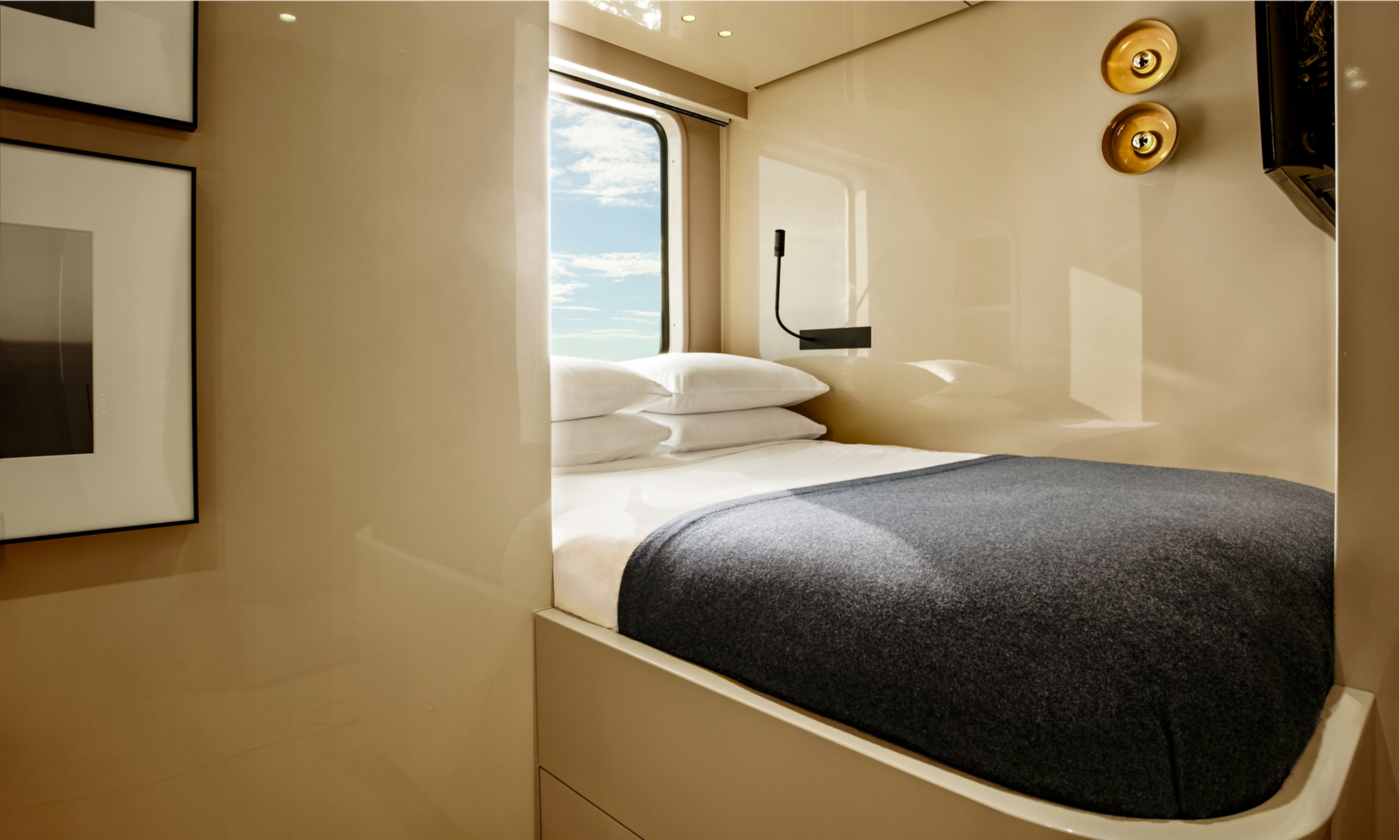 Champagne lacquered walls reflect sea and sky in the vessel’s three guest cabins.