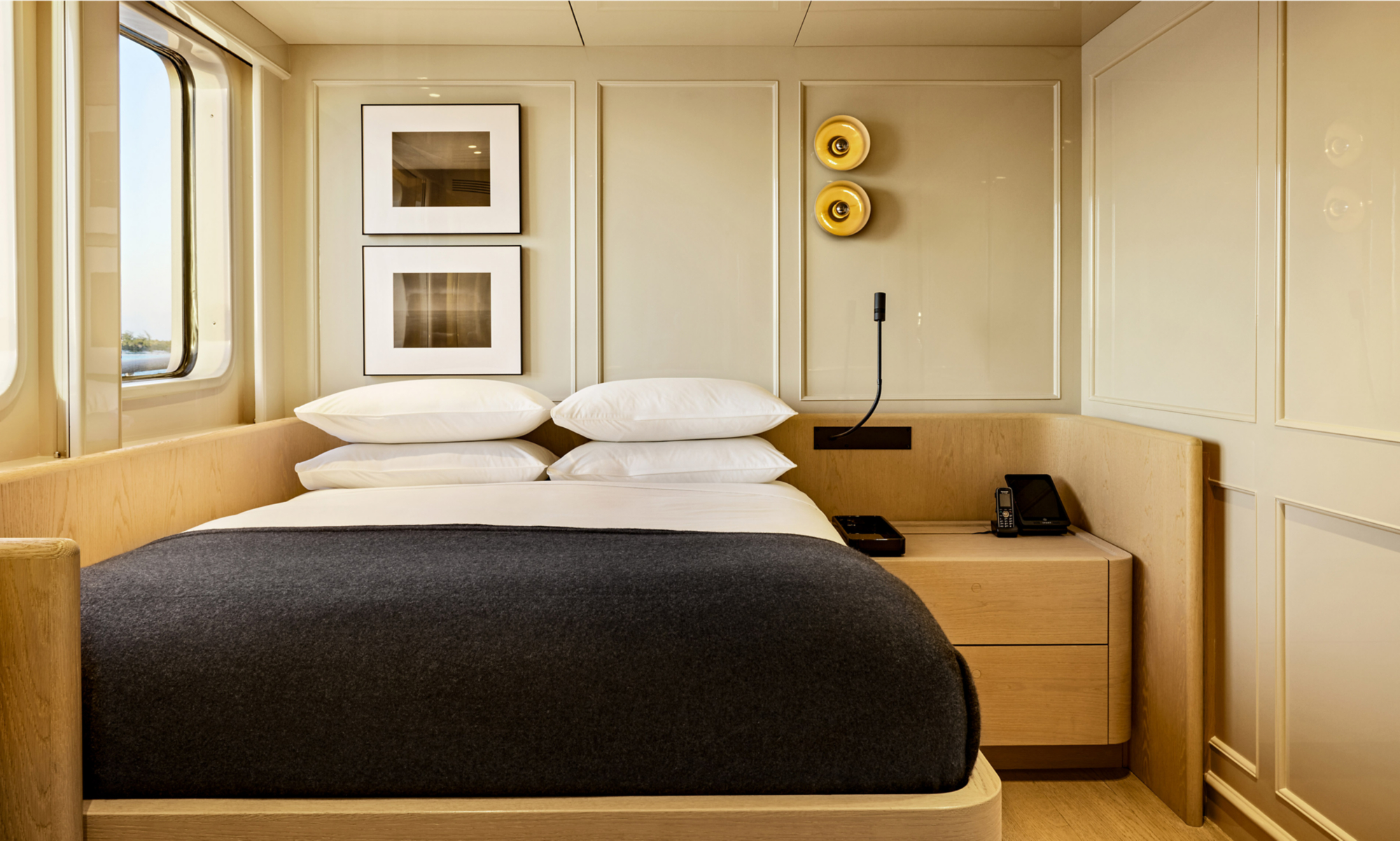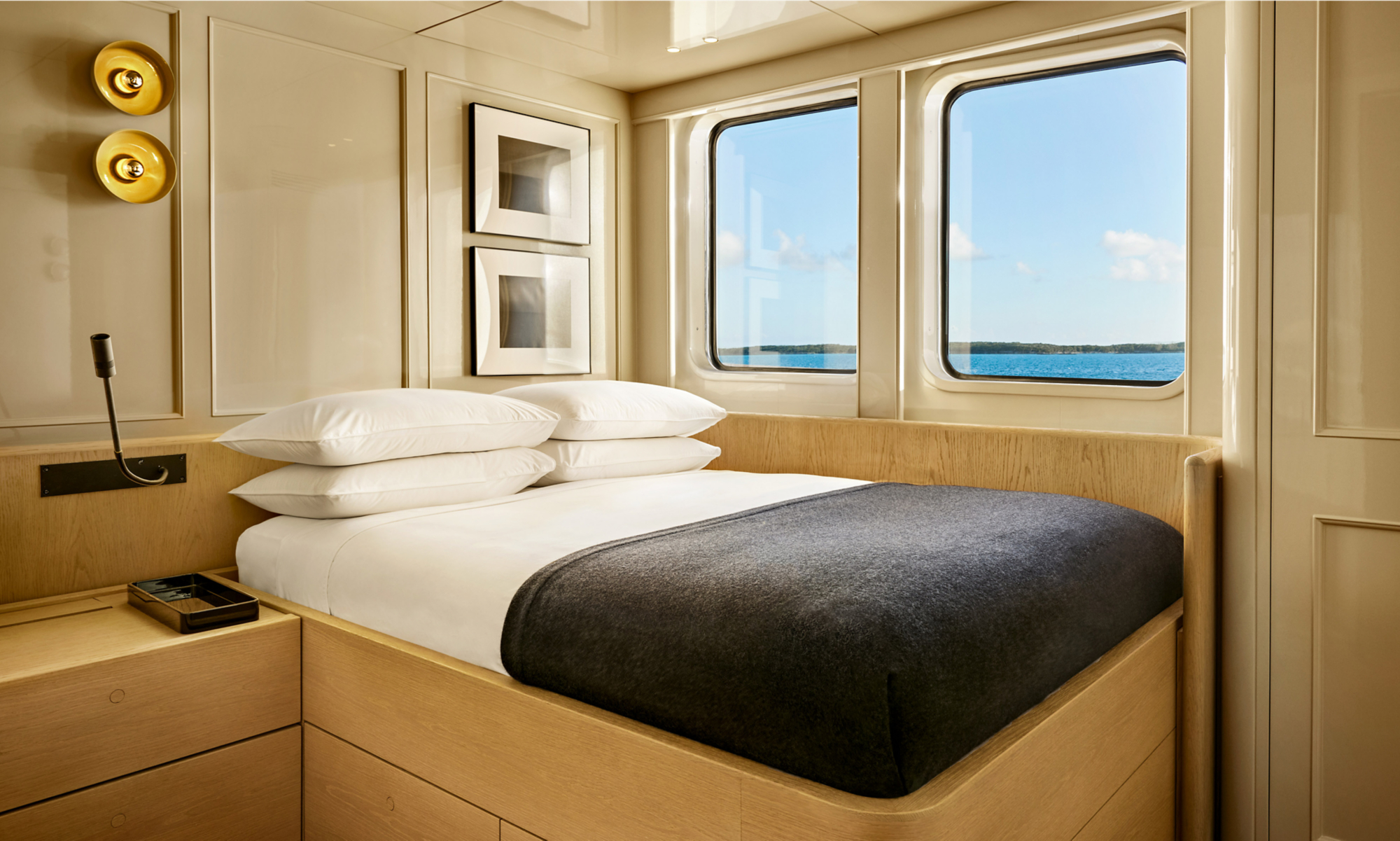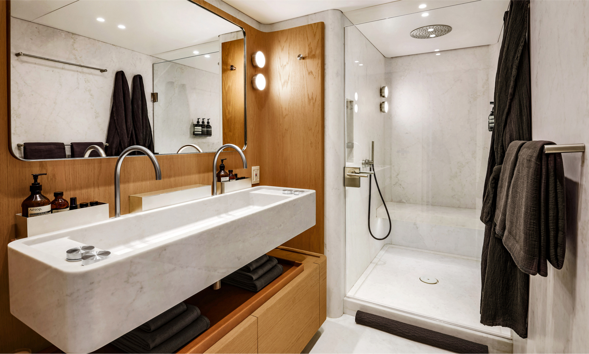 With an expanse of floor-to-ceiling windows reflected in luminous lacquered panels overhead, the primary cabin sets a stunning oceanic scene. Spanning the full width of the vessel, these spacious private quarters feature a soaring headboard surround finished in braided rope, with crisp Swiss percale bedding, handwoven cashmere throws and an ensuite bath sheathed in Italian Carrara marble.
