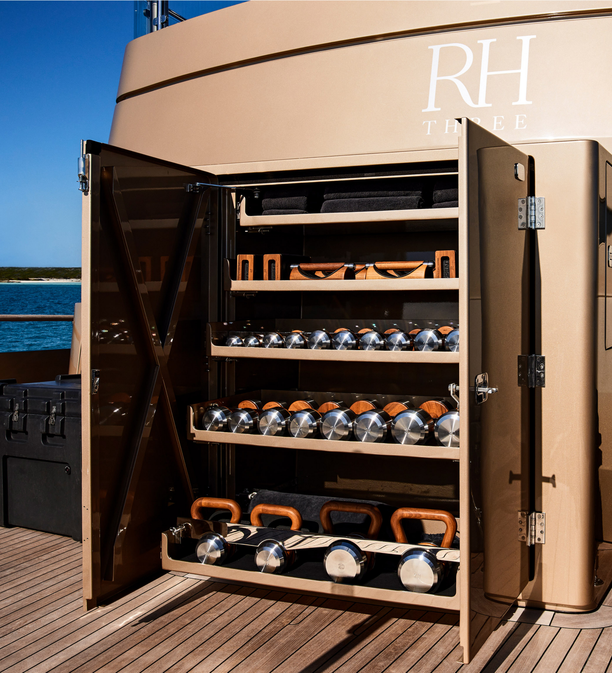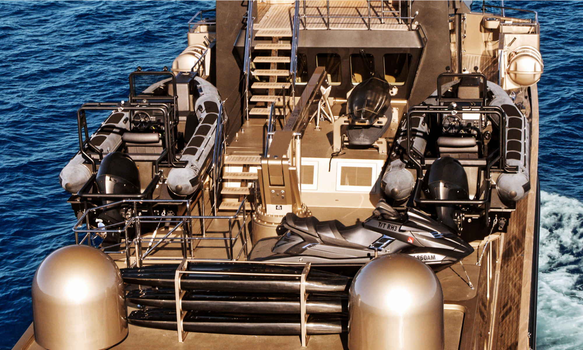 The boat deck houses RH THREE’s extensive collection of toys, designed to echo the yacht’s understated Phantom Grey and metallic champagne palette.