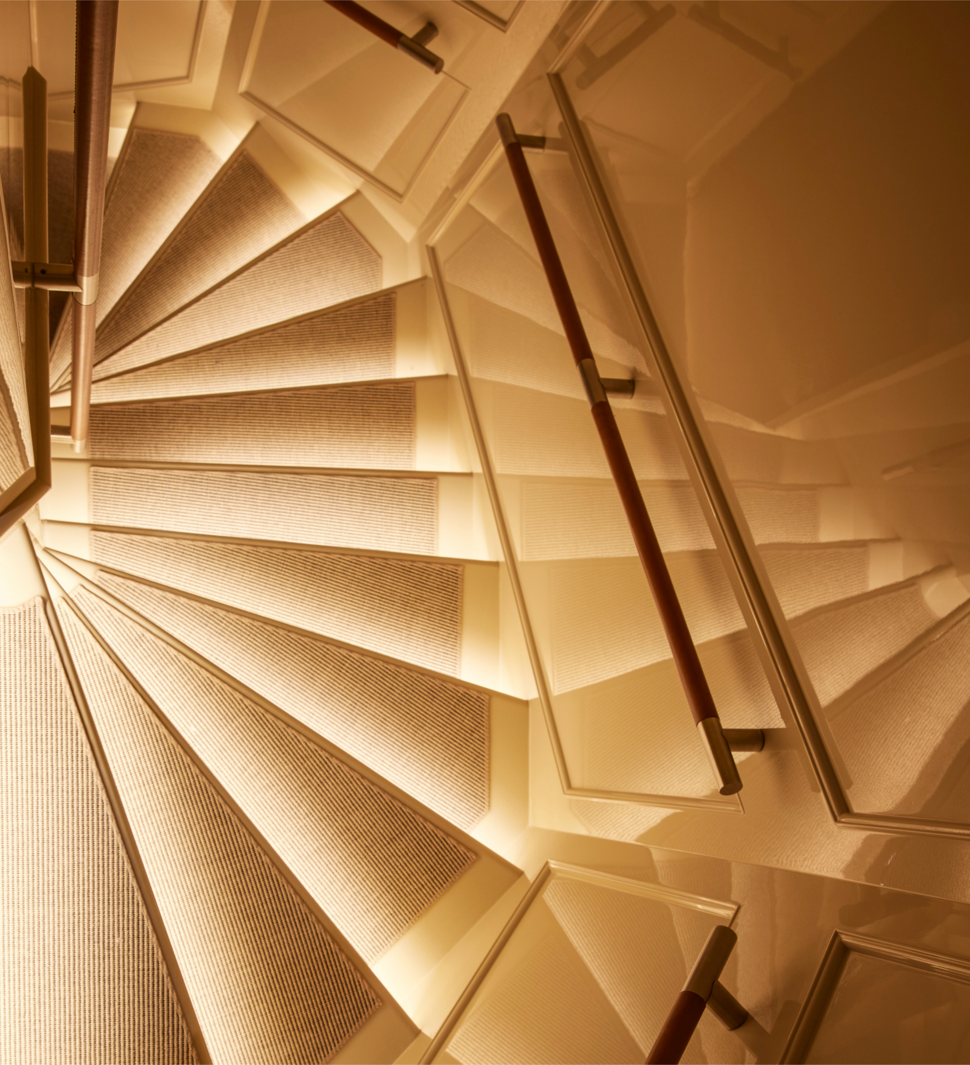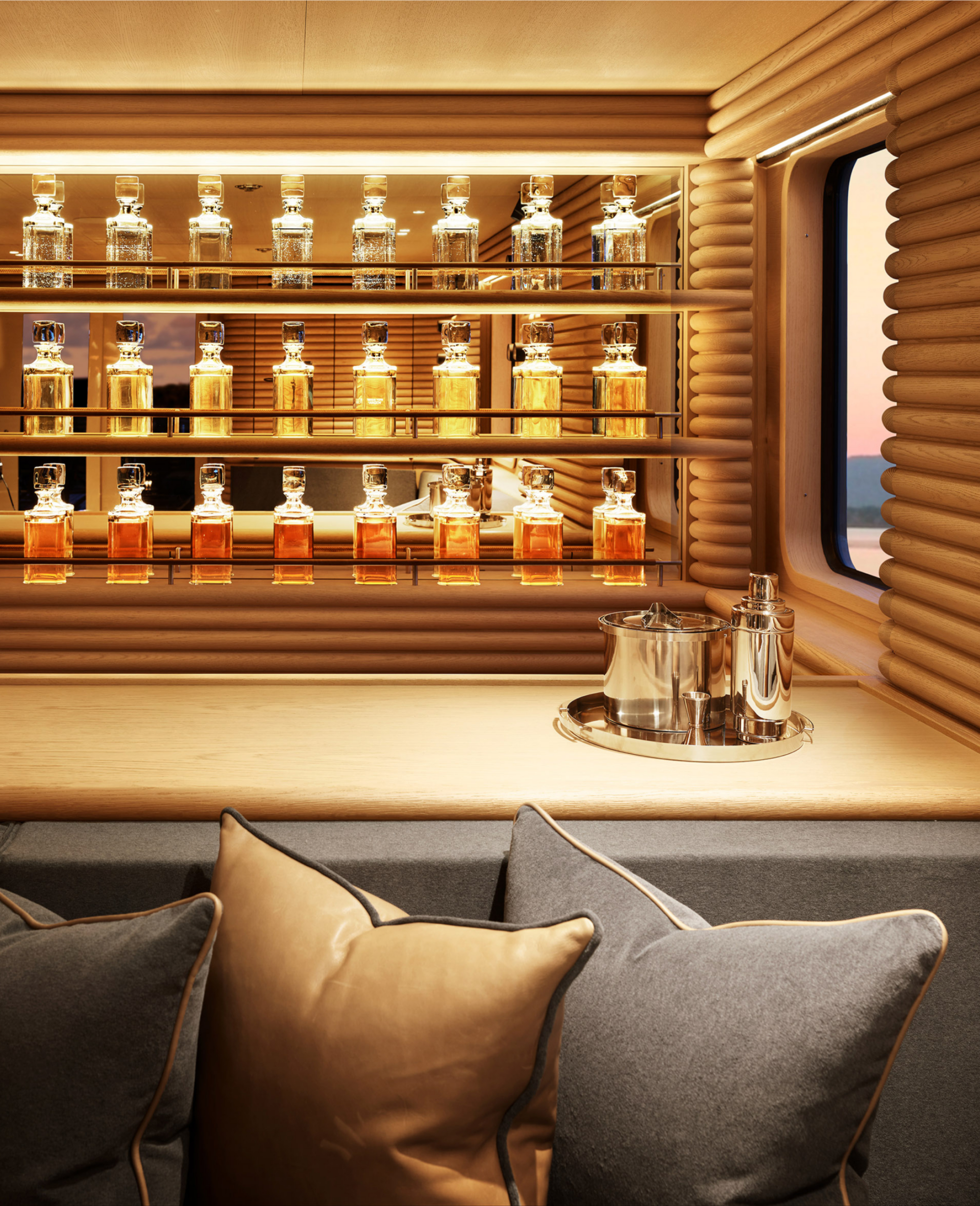 In the Sky Lounge, ribbed walls of carved white oak evoke stacked naval rope, while contoured windows frame dramatic seascape views. This intimate statement space features integrated platform seating, maritime-inspired lighting and an illuminated bar displaying Rogaska crystal decanters of select spirits from around the world.