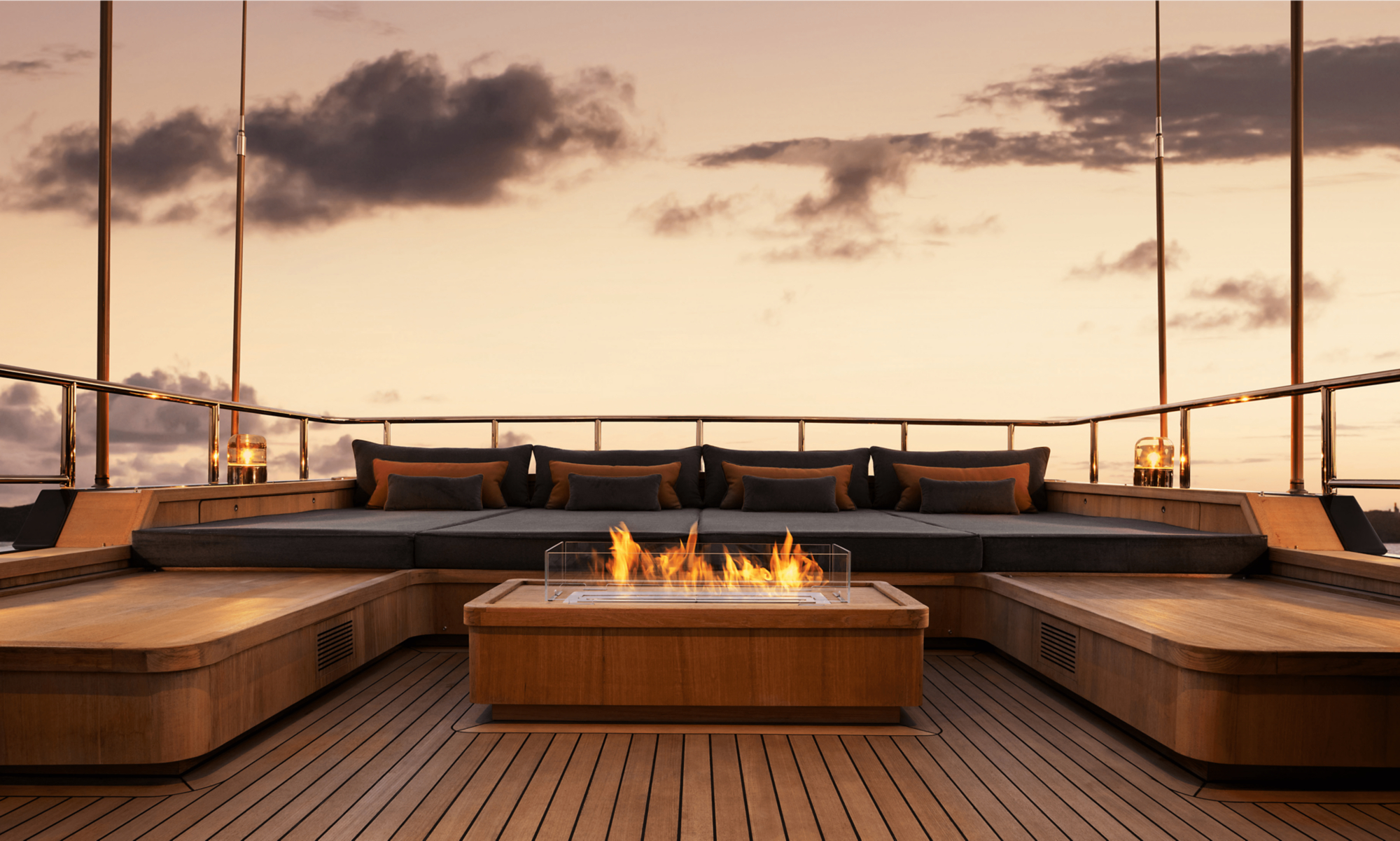 The highest point on the yacht, RH THREE’s Sky Deck features the Sunset Terrace. The ultimate vantage point for soaking up the scenery or enjoying an after-dinner drink, this outdoor lounge area is equipped with a generous daybed and teak fire table.