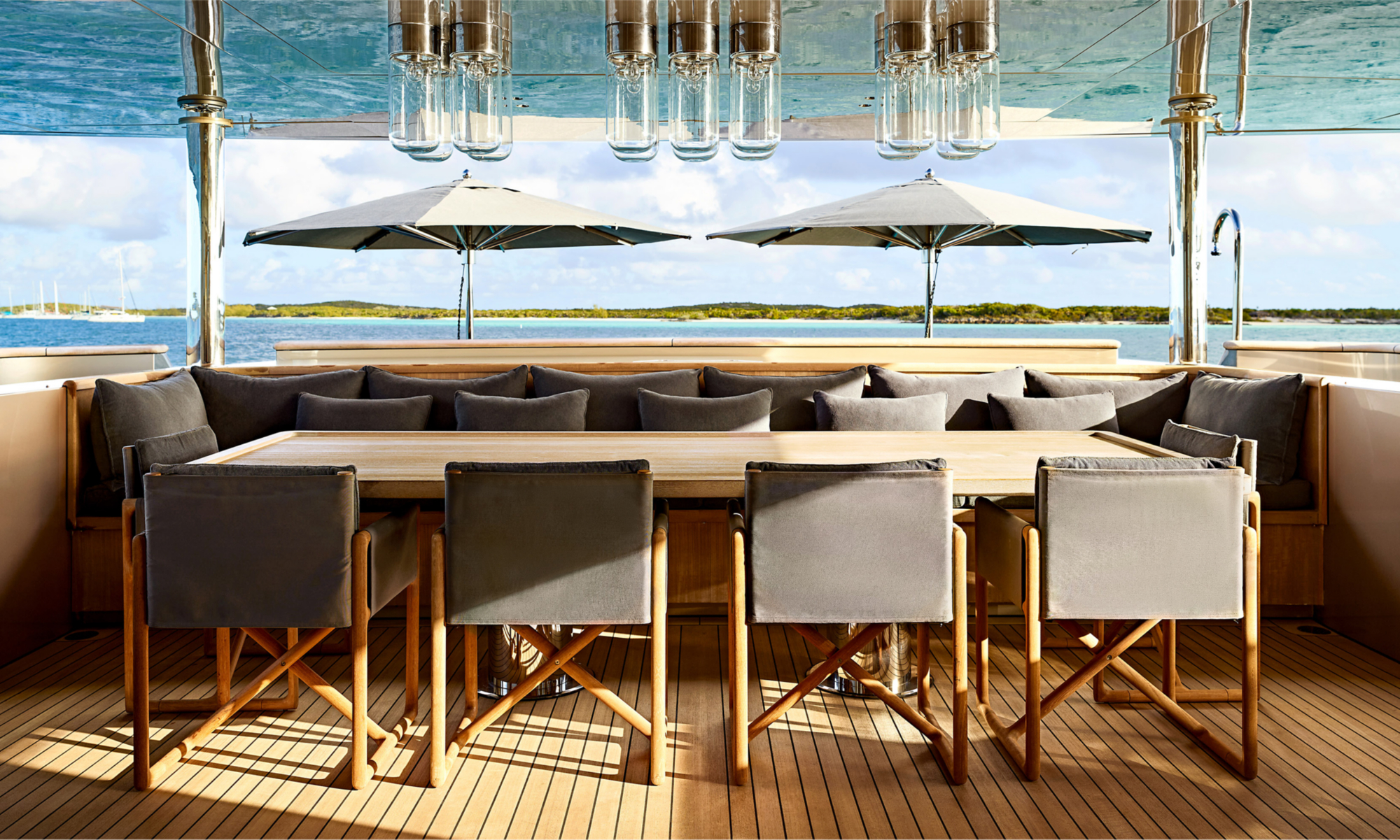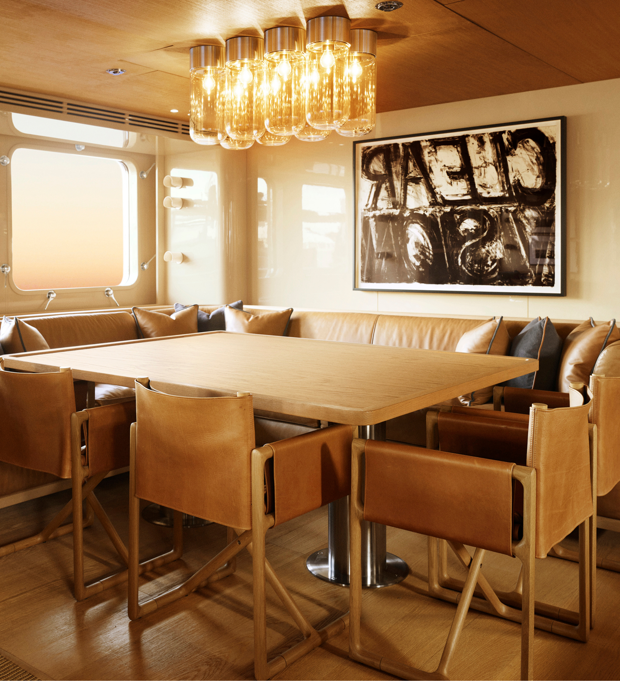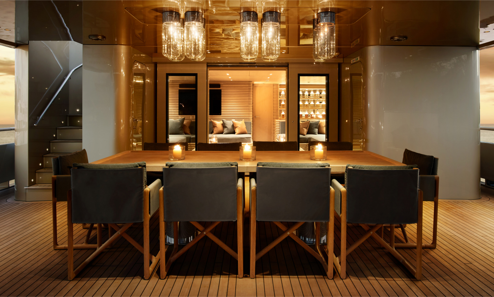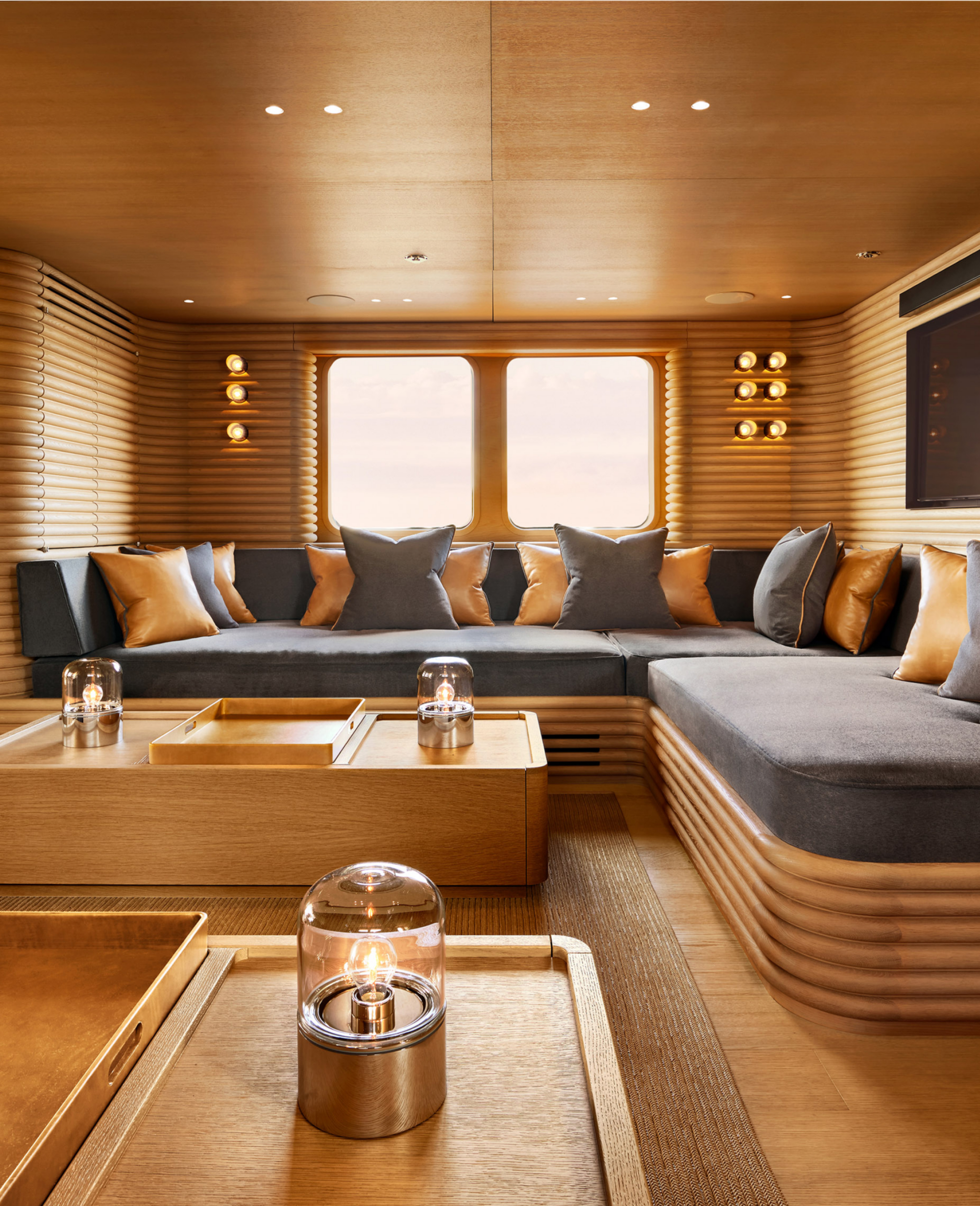 Stepping aboard the main deck, passengers enter the Salon, the first of several lounge and dining spaces that blur the lines between indoors and out. Champagne lacquer, wire-brushed white oak, caramel Italian leather, charcoal performance velvet and custom lighting by PSLab continue the visual language established by the yacht’s exterior.